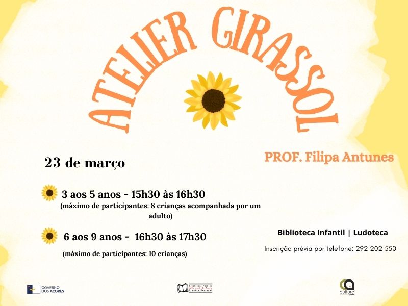 A Direção Regional dos Assuntos Culturais, através da Biblioteca Pública e Arquivo Regional João José da Graça, irá realizar o “Atelier do Girassol”, com a Prof.ª Filipa Antunes, destinado a crianças, no dia 23 de março (sábado), na Biblioteca Infantil/Ludoteca.